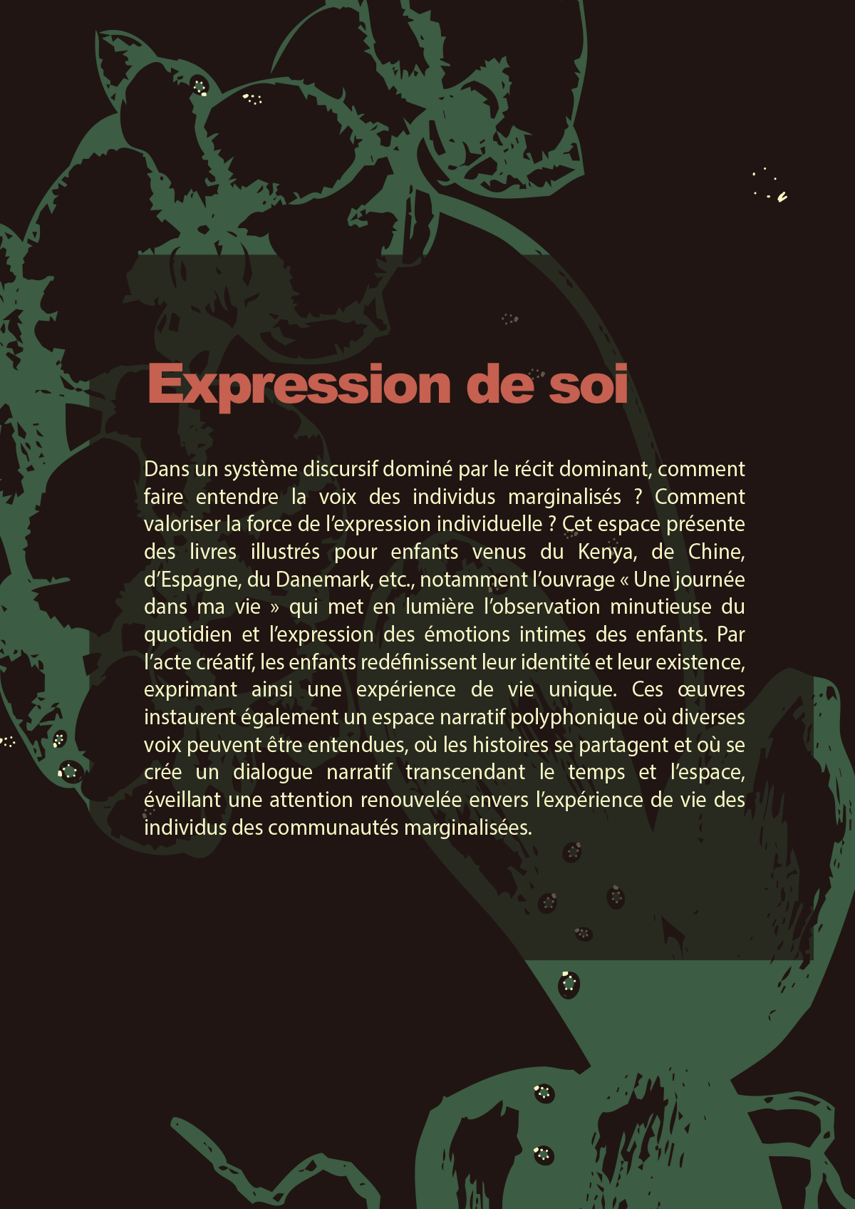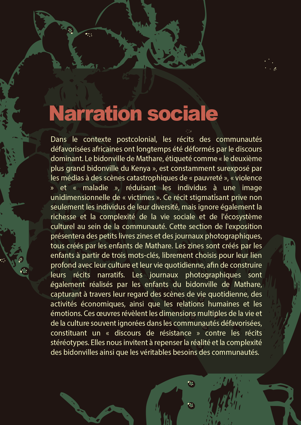 L’exposition se concentrera sur la présentation des œuvres artistiques et des récits des enfants et des adolescents de la communauté de Mathare, en mettant l’accent sur l’auto-expression, la vie sociale et les visions d’avenir à travers leur regard. Nous souhaitons explorer le rôle de l’art comme moyen de narration, en tant qu’outil puissant pour conférer aux individus et aux communautés le pouvoir d’agir. Cet espace vise à offrir aux groupes marginalisés la possibilité de raconter leurs histoires personnelles ou collectives et, ainsi, de développer un « discours de résistance » qui transcende les limites du récit dominant et leur permette d’exprimer leur force et leur influence (Polletta et al., 2011 ; Somers, 1994). Parallèlement, l’exposition regroupera une diversité d’œuvres de livres illustrés pour enfants en provenance de Chine, d’Espagne, du Danemark, etc., soulignant le concept de « polyvocalité » et créant un pont de dialogue entre différentes régions et cultures.
