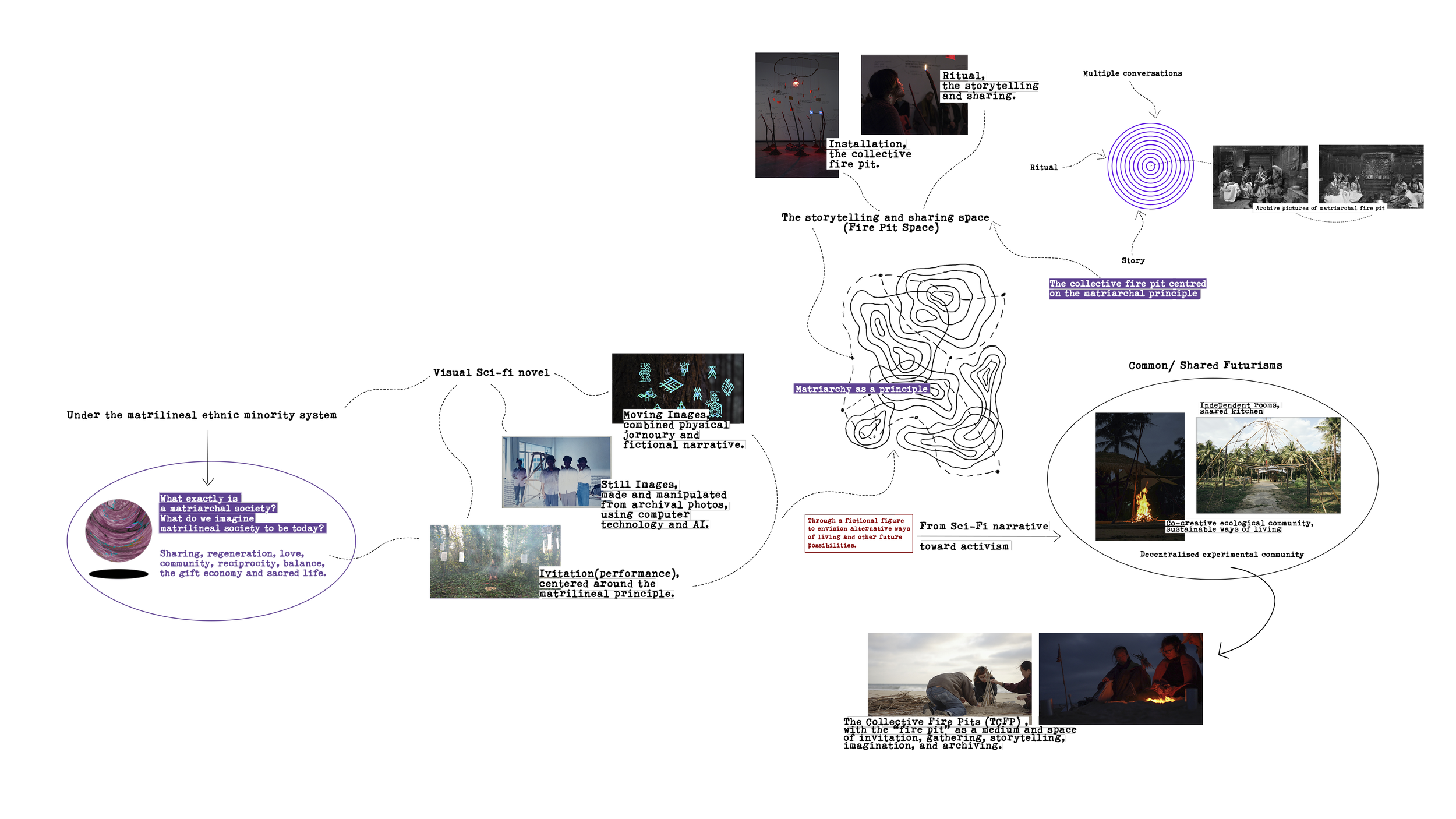 From the primal fire where stories were first shared between mountains and fields, to the fire pits in the ancestral rooms of matrilineal villages by Lugu Lake, where the spirits of ancestors reside, to the communal bonfire pits of collective communities where “many hands gather wood”. Around the matriarchal principles centred on sharing, regeneration, love, community, reciprocity, balance, the gift economy, and sacred life ignite, different stories ignite different fires, constructing different fire-pit "houses", bright or dim, large or small, all ultimately contributing to the collective fire pit.